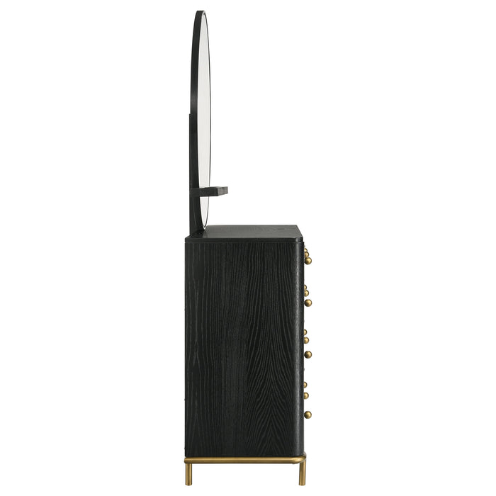This mid-century modern dresser and mirror set blends elegant design with versatile functionality. The eight-drawer dresser features a wire-brushed sand wash finish, aged brass knobs, and slender metal legs for a refined touch. Felt-lined top drawers offer safe storage for delicate items, while softly rounded corners add subtle sophistication. Above, the round mirror includes a felt-lined tray and can be mounted to the dresser or hung independently on the wall, offering flexible styling and practical beauty for any bedroom._x005F_x000D_ Key Features: • Eight-drawer dresser in sand wash wire-brushed finish for natural texture • Aged brass knobs and slim metal legs offer modern mid-century charm • Felt-lined top drawers protect jewelry and delicate accessories • Round mirror includes felt-lined tray for storage and display • Mirror mounts to matching dresser or hangs freely on the wall • Crafted from rubberwood, engineered wood, and ash veneer