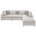 Covered in a linen-like fabric all around, this super comfy five-piece sectional offers all the seating you need in an open concept living room or entertainment area. Designed with two armless chairs, two corner chairs and a single oversized ottoman, this contemporary modular sectional offers reversible back pillows and jacquard accent pillows that you can really sink into. Black feet peer from beneath, offering a slight elevation for rugs and other flooring. With an L-shape design, this sectional works in a variety of room dimensions. A spacious ottoman also doubles as a coffee table, keeping a tray of refreshments and snacks when hosting guests. Key Features: • Experience ultimate comfort with this fashionable sectional • Modular construction allows you to easily build the perfect seating area for your space • Feather blend seat and back cushions for the best seat experience • Accent pillows in a soft jacquard are included • All cushions are reversible making it easy to clean and maintain